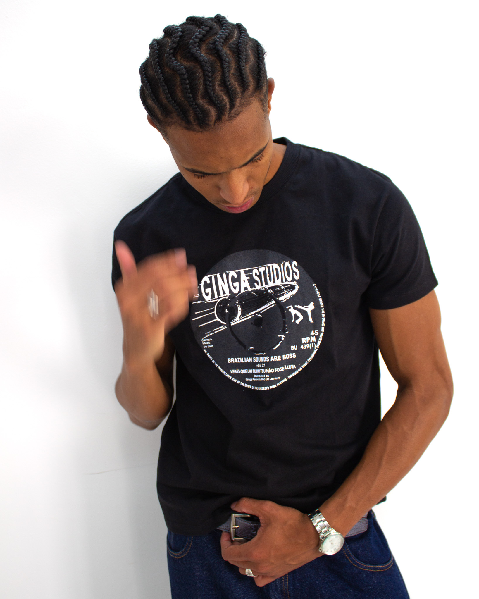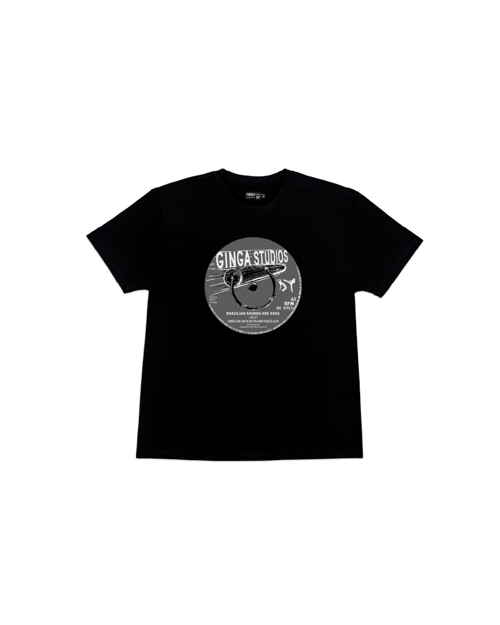Brazilian Sounds Are Boss — A estampa traz um vinil atravessado por uma bala, homenagem à força e à intensidade da música brasileira, que resiste e ecoa. Produzida em 100% algodão brasileiro orgânico, cada T-shirt é estampada à mão no Rio de Janeiro.