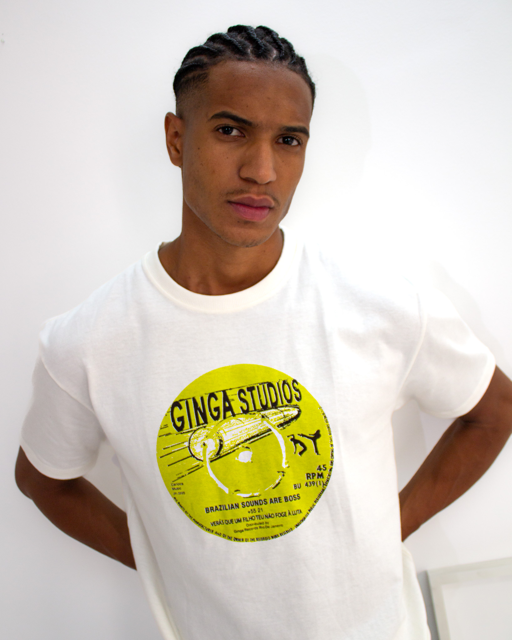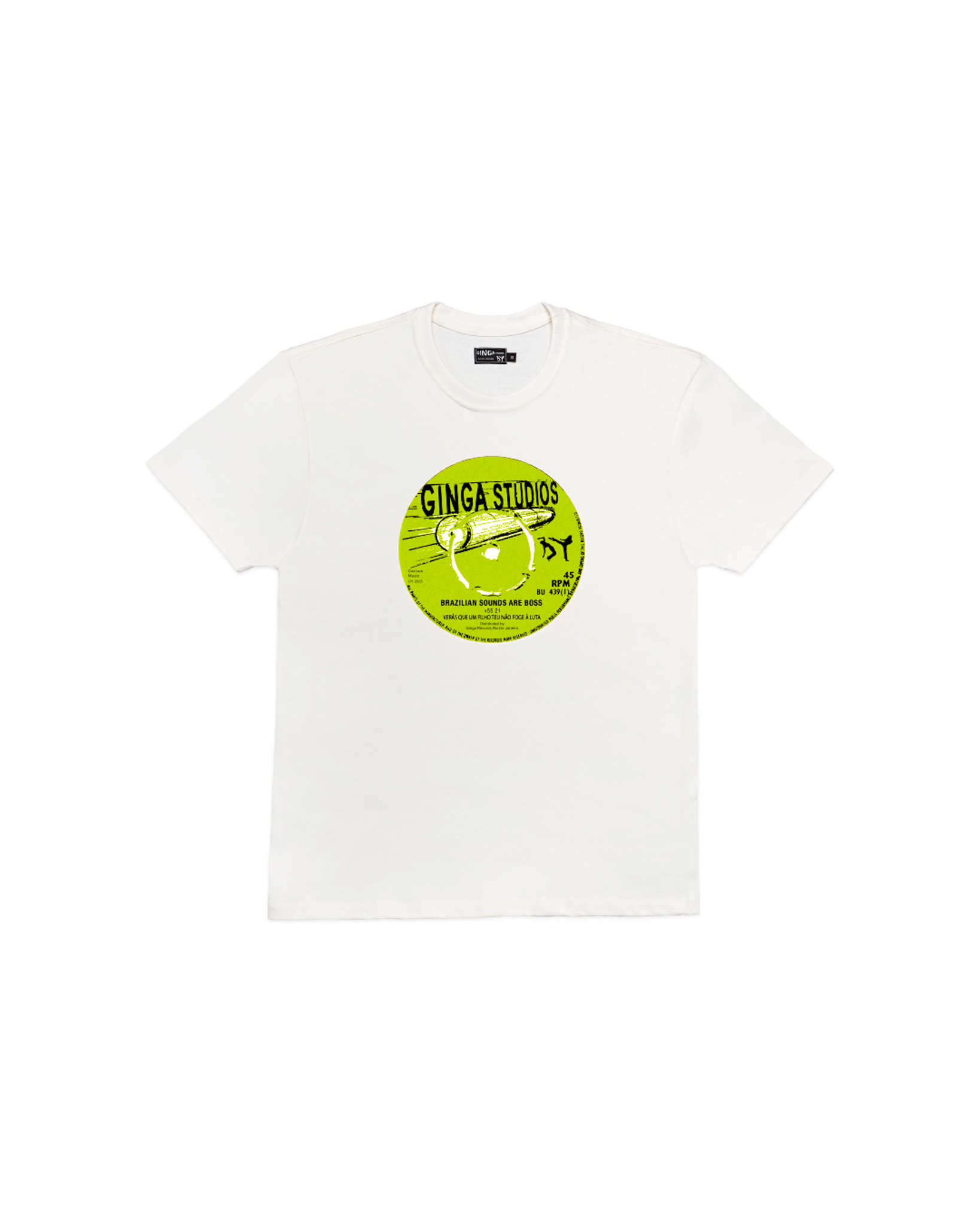 Brazilian Sounds Are Boss — A estampa traz um vinil atravessado por uma bala, homenagem à força e à intensidade da música brasileira, que resiste e ecoa. Produzida em 100% algodão brasileiro orgânico, cada T-shirt é estampada à mão no Rio de Janeiro.