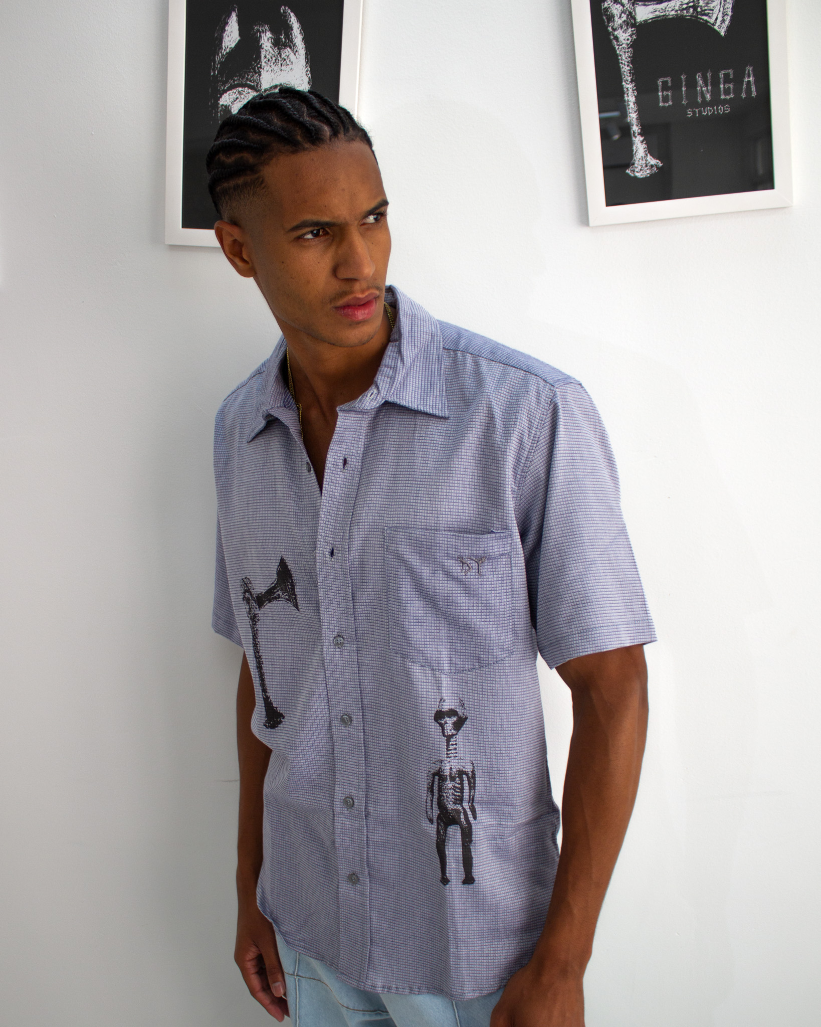 Uma camisa que une tradição e expressão. Com símbolos inspirados em culturas africanas, ela carrega histórias que atravessam o tempo e ganham novas formas no presente.