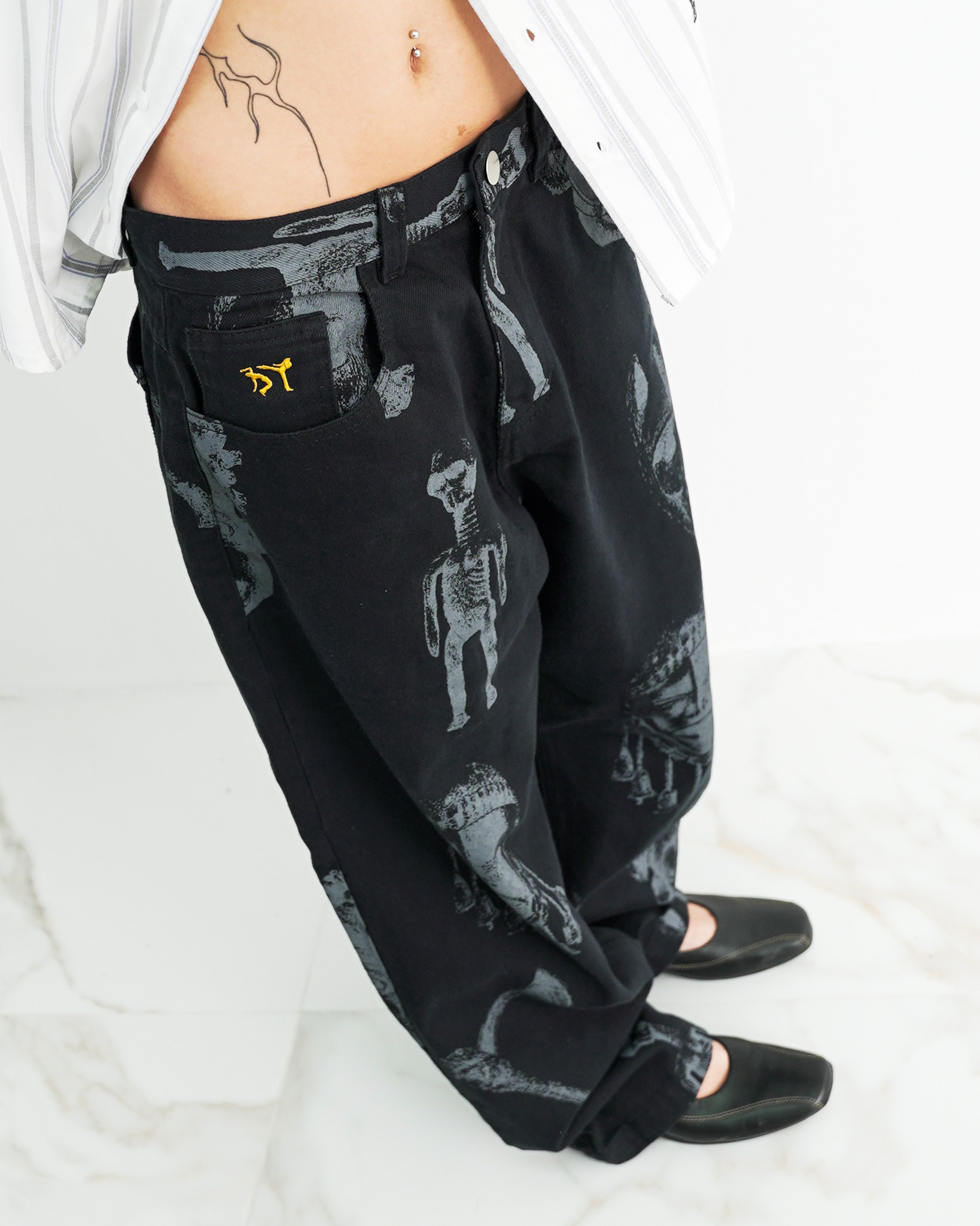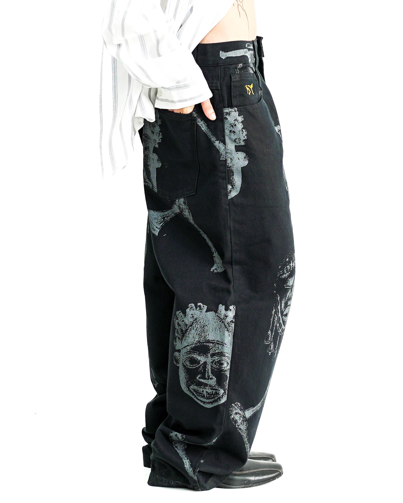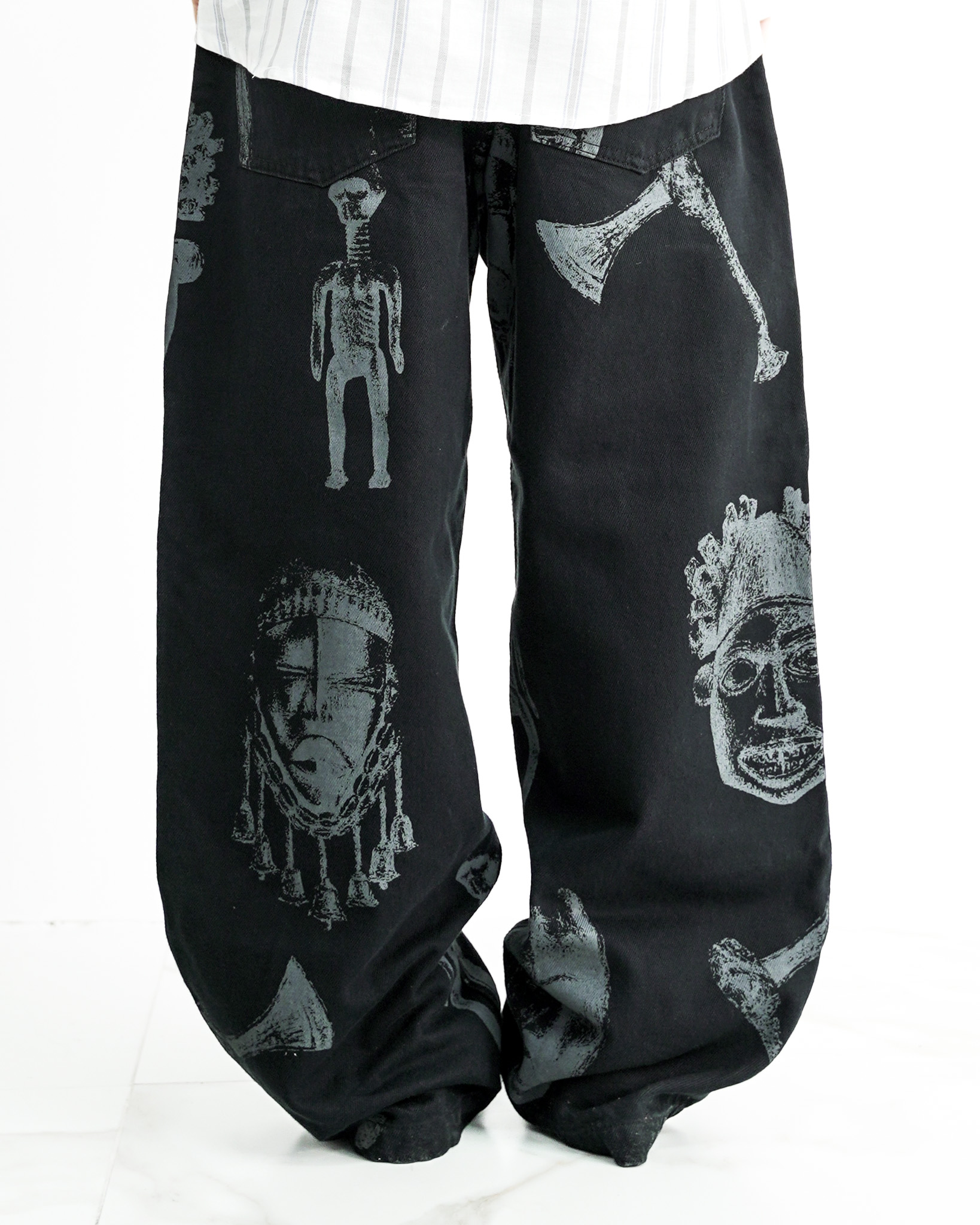 Esta peça traz estampas que conectam máscaras e objetos às tradições africanas, carregando histórias de resistência e identidade. Inspirada em práticas culturais que valorizam a ancestralidade e a proteção, a calça combina referências clássicas com um olhar contemporâneo, criando um equilíbrio entre memória e estilo.